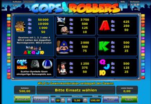 Für Kinder ist diese Slot Maschine natürlich nicht gedacht, die seit Ende 2013 im Novoline Casino auf dich wartet. Hier wird nämlich um große Gewinne gezockt – in einer spannenden Atmosphäre, wie sie Novoline Spiele ja eigentlich fast immer ausmacht. Selbstverständlich kann Cops ’n‘ Robbers im Online Casino gratis ausprobiert werden; zum Beispiel, wenn es dir ausschließlich darum geht, deinen Job als Polizist gut zu machen und ein bisschen Nervenkitzel zu genießen. Noch reizvoller erscheint jedoch die optionale Einzahlung, in deren Anschluss du dir bis zu 50.000 Euro sichern kannst.