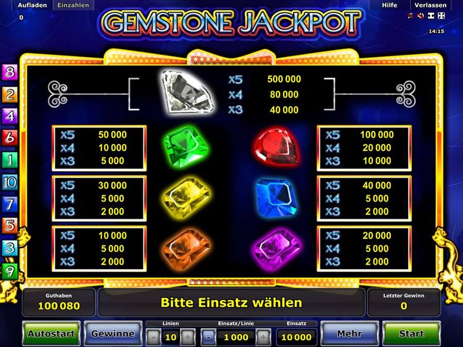 Wie Gemstone Jackpot funktioniert und du die dicken Gewinne einfahren kannst erfährst du hier auf der Seite. Oder wenn du dieses Novoline Spiel gleich kostenlos im Browser spielst. Da du dafür kein Geld einzahlen musst gibt es natürlich auch kein Risiko. Was es aber gibt sind die gleichen Chancen und Features wie wenn du im online Casino um echtes Geld spielen würdest. So hast du die einmalige Gelegenheit völlig risikolos einige Strategien und Dinge auszuprobieren.