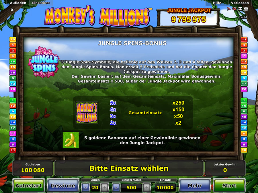 Tauch ein in die Welt der wilden und reichen Affen. Schließlich hat einer davon dem Novoline Spiel den Namen gegeben. Auf den fünf Walzen dieses online Slots tauchen dazu noch weitere Tiere auf, die für hohe Gewinne und weitere Besonderheiten sorgen. Wichtig ist auch zu wissen, dass du in diesem online Casino Spiel bis zu 20 Gewinnlinien aktivieren kannst. Die Einsätze zwischen zwei Cent und fünf Euro werden aber auf jede aktive Gewinnlinie gemacht. Wenn du also die maximale Anzahl an Gewinnchancen spielen möchtest kostet dich ein Dreh zwischen 40 Cent und 100 €.