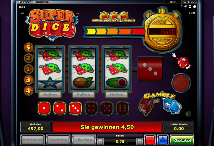 Würfel sollen dir bei Super Dice helfen, jede Menge Freispiele zu gewinnen. Du kriegst immer so viele kostenlose Runden ausgespielt, wie Augen auf den Würfeln zu erkennen sind – pro Partie also maximal sechs. Auch an dieser Stelle werden Novoline Fans nicht gleich Luftsprünge machen; bis zu dem Augenblick, wo ihnen die Multiplikatoren offenbart werden. Zufallsgewinne gibt es im Spiel ebenfalls. Die Stoppuhr ist das Motiv, das dich mit Sonderzahlungen versorgt. Um das Automatenspiel testen zu können, brauchst du nichts weiter als einen Account im Stargames Casino.