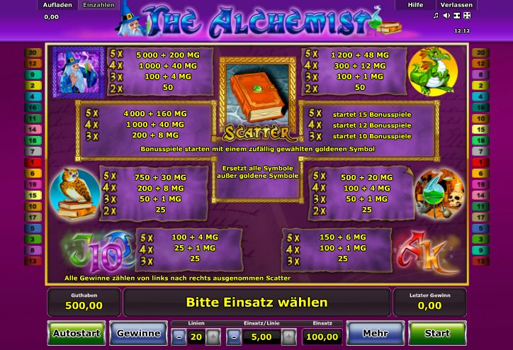 The Alchemist bietet dir die Möglichkeit, bis zu 20 Gewinnzeilen auf fünf Walzen zu aktivieren. Logischerweise bringen dir diese Reihen besonders viele Gewinnchancen, so dass es Sinn macht, alle Linien für dich zu nutzen. Je weniger Zeilen du aktivierst, desto stärker senkst du die Gewinnwahrscheinlichkeit. Jede Payline kostet dich 2 Cent Mindesteinsatz, und wie üblich darfst du auch diesmal entscheiden, ob und wann du diesen Betrag steigerst.